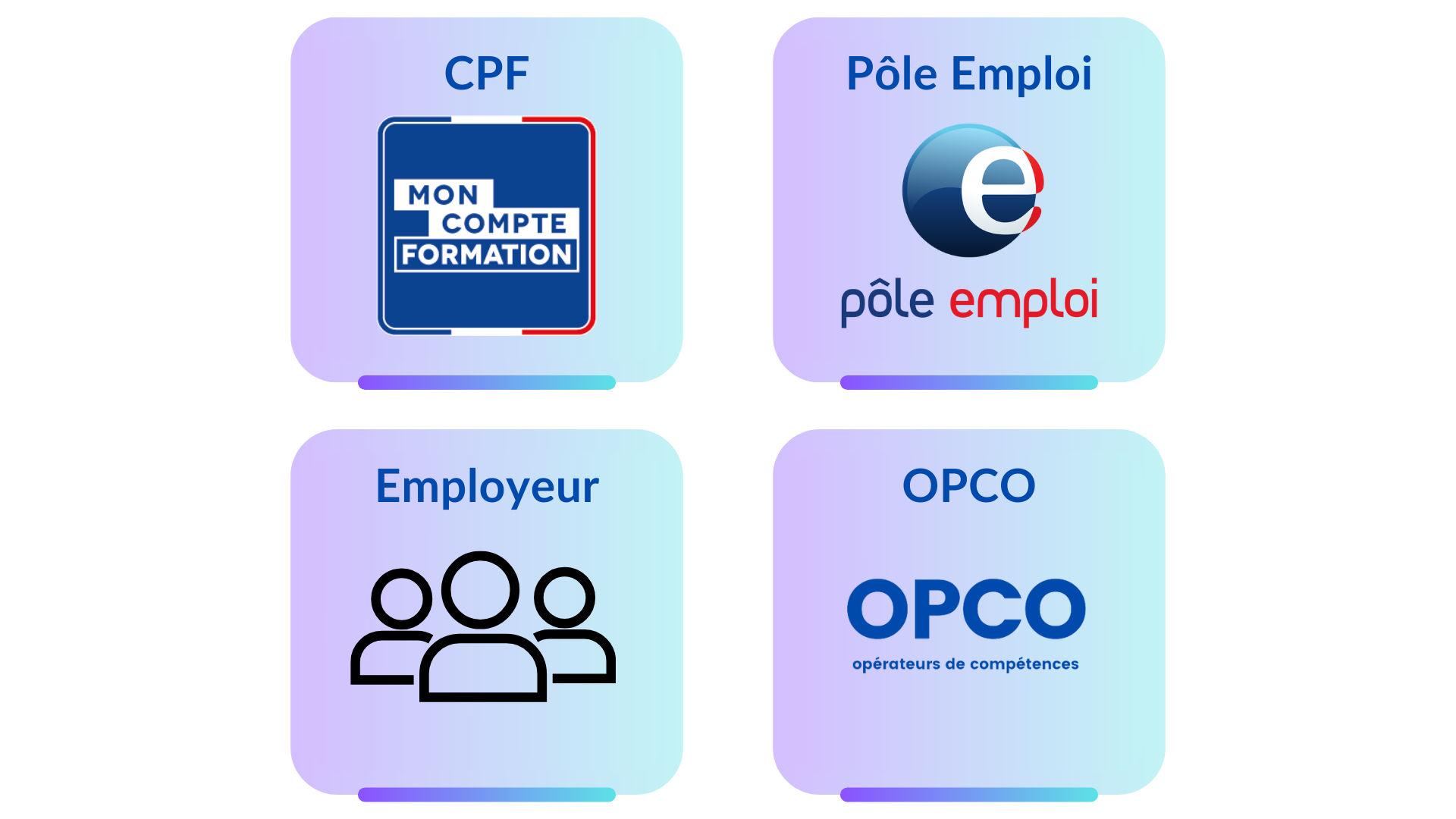 Que ce soit en utilisant le CPF, Pôle Emploi, l'employeur, ou un Opérateur de Compétences, chaque voie d'inscription est finançable à 100%