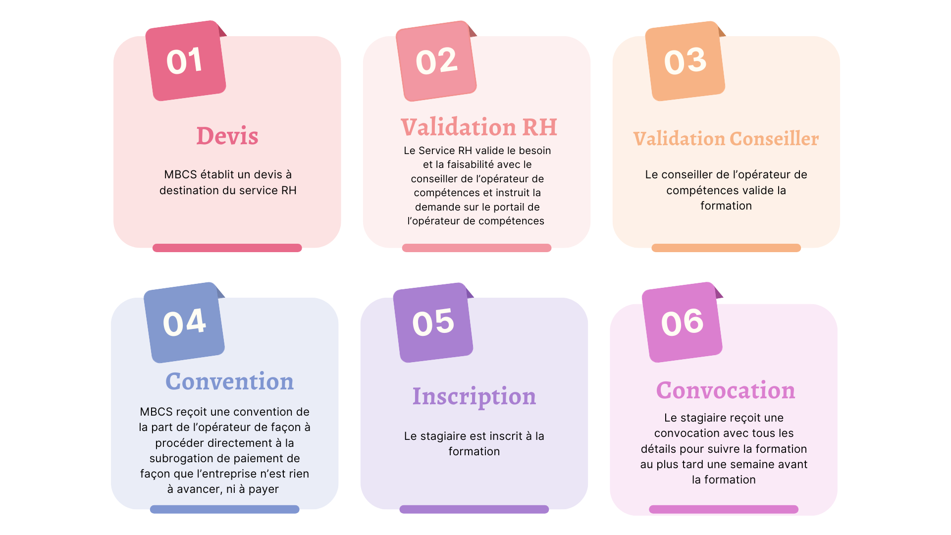 - MBCS émet une convention de formation à cosigner par l'entreprise, qui la soumet à l’opérateur de compétences de façon à procéder directement à la subrogation de paiement